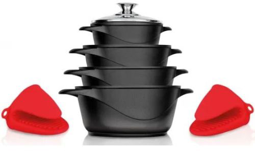 MGK-12 katlu komplekts sastāv no četriem katliem ar vākiem. Papildus komplektā ir praktiski, silikona cimdi, kas atvieglo virtuves darbu.