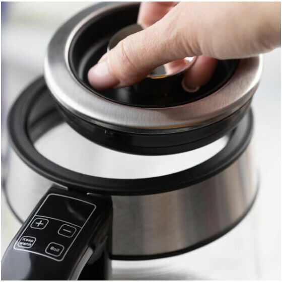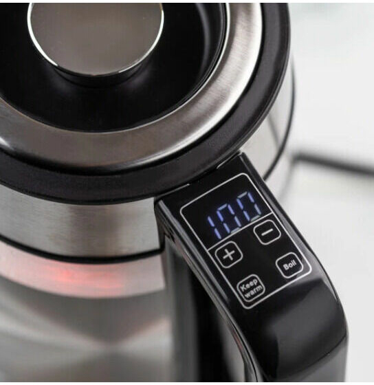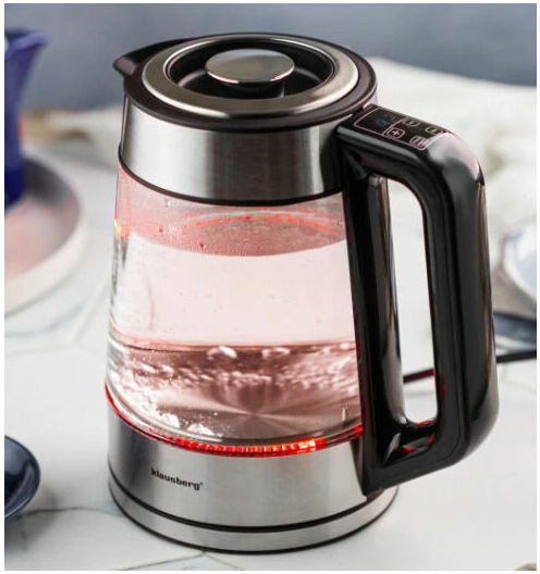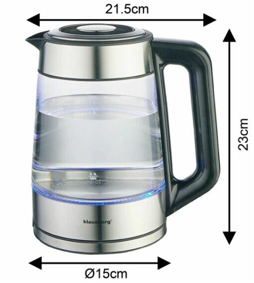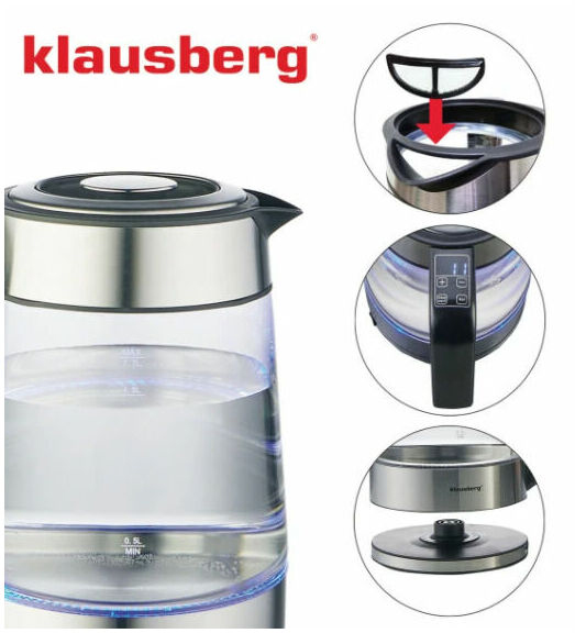 Elektriskā tējkanna Klausberg KB 7888 no borosilikāta stikla un 304 nerūsējošā tērauda ar LED apgaismojumu, tilpums 1,7 l un jauda 1850–2200 W. 1,7 litru ietilpība ir lieliski piemērota vairāku tasīšu iecienītākās tējas vai kafijas pagatavošanai. Jauda 1850–2200 W nodrošina ātru ūdens uzvārīšanu pat pilnai tējkannai. Temperatūras regulēšana no 40°C līdz 100°C padara to ideāli piemērotu dažādu dzērienu pagatavošanai – no maigas zaļās tējas līdz verdošam ūdenim kafijai. RGB LED apgaismojums maina krāsu atkarībā no ūdens temperatūras (0°C–40°C zila, 40°C–50°C gaiši zila, 50°C–60°C zaļa, 60°C–70°C dzeltena, 70°C–80°C violeta, 90°C–100°C sarkana), radot iespaidīgu vizuālo efektu virtuvē. Siltuma uzturēšanas funkcija saglabā izvēlēto temperatūru ilgāku laiku, bet līdz 10 minūšu iestatījumu atmiņa ļauj ierīcei atcerēties pēdējos iestatījumus pēc īsa strāvas pārtraukuma. Ergonomisks rokturis ar LCD paneli nodrošina ērtu lietošanu un modernu dizainu. 360° grozāmā pamatne ir ērta gan labročiem, gan kreiļiem, slēptais plakanais sildelements atvieglo tīrīšanu un nodrošina higiēnu, bet snīpī integrētais filtrs garantē tīru ūdeni katru reizi. Izturīgais borosilikāta stikla un 304 nerūsējošā tērauda korpuss apvieno izturību un estētiku, savukārt automātiskā izslēgšanās, aizsardzība pret pārkaršanu un ieslēgšanu bez ūdens, kā arī neslīdoša pamatne un hermētiska konstrukcija nodrošina pilnīgu drošību, stabilitāti un aizsardzību pret noplūdēm.