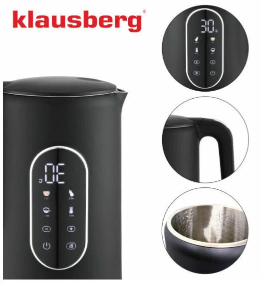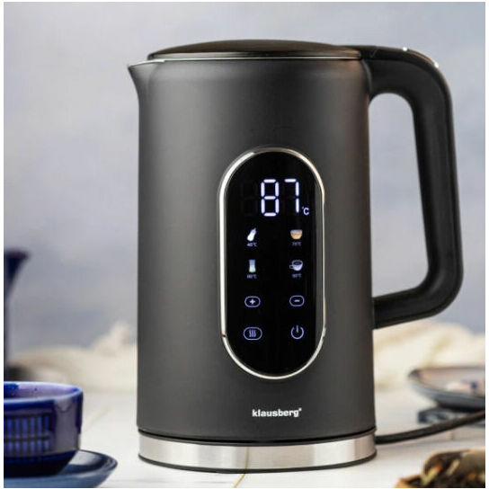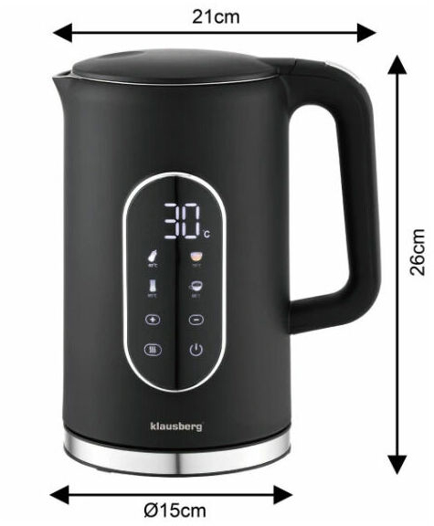 Elektriskā tējkanna Klausberg KB 7891 no nerūsējošā tērauda ar LED paneli, melnā/sudraba krāsā, tilpums 1,7 l un jauda 1850–2200 W. 1,7 litru ietilpība padara to ideāli piemērotu ikdienas lietošanai mājās vai birojā, savukārt jaudīgais 1850–2200 W sildelements nodrošina ātru ūdens uzvārīšanu pat pilnai tējkannai. Mūsdienīgais skārienjutīgais LED panelis nodrošina intuitīvu visu funkciju vadību, tostarp 13 pakāpju temperatūras regulēšanu no 40°C līdz 100°C ar 5°C soli un 4 iepriekš iestatītus režīmus: piens (40°C), medus (70°C), zaļā tēja (80°C) un kafija (90°C). Temperatūras displejs vienmēr parāda aktuālo ūdens temperatūru pilnīgai kontrolei. Snīpis ar iebūvētu sietiņu aiztur nosēdumus un kaļķakmens daļiņas, nodrošinot tīru ūdeni katrā tasītē, bet slēptais plakanais sildelements garantē higiēnisku lietošanu un vieglu tīrīšanu. 360° grozāmā pamatne ir ērta gan labročiem, gan kreiļiem, bet iekšējā konstrukcija no 304 nerūsējošā tērauda nodrošina izturību, aizsardzību pret rūsu un vieglu kopšanu. Papildu priekšrocības ir ūdens līmeņa indikators abās pusēs, ergonomisks rokturis ar vāka atvēršanas pogu ērtai lietošanai ar vienu roku, moderns matēti melns dizains ar elegantiem sudraba akcentiem, kā arī automātiskā izslēgšanās un aizsardzība pret pārkaršanu drošai lietošanai.